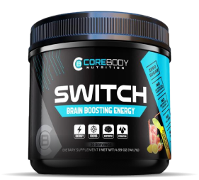 Looking for long lasting energy with out the jitters or crash? Corebody Nutrition’s Switch Brain Boosting energy has you covered with our 3-Step formula. Hydration from vitamins and electrolytes, regular caffeine and a time-released caffeine. Then topped off with Nootropics and Ashwagandha for brain & cognitive enhancement and reduced stress.